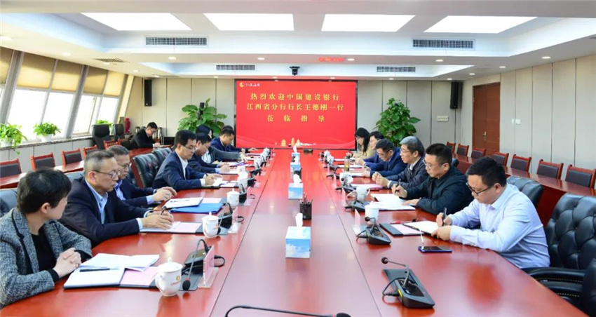 近日,建设银行江西省分行行长王德刚一行到集团公司走访交流,集团公司党委书记、董事长揭小健,党委副书记、副董事长、总经理曾昭和及集团董事、财务总监李松参加,双方就深化银企合作进行了友好交流。