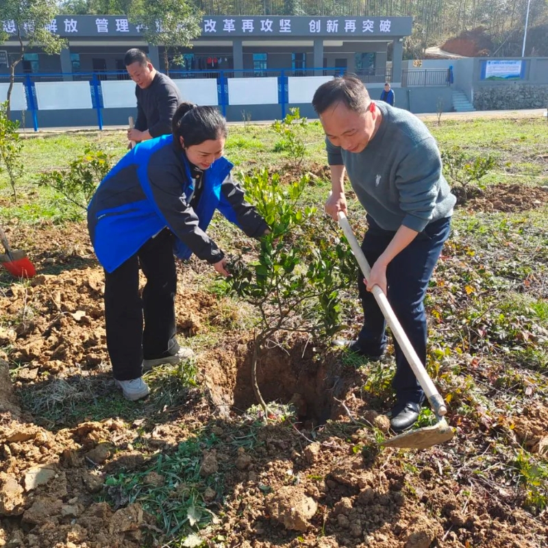 活动现场,党旗飘扬,苗木、化肥等已摆放整齐,铁揪、水桶、手套也准备就绪。大家分工有序、干劲十足,两三人一组,挥锹铲土、扶正苗木、填坑夯苗、提桶浇水,各个环节井然有序。不少同志热情地传授起植树经验,如何使用铁锹最省力,怎样摆放能让树苗存活率更高,场面异常繁忙火热。通过大家辛勤劳动,300余棵树苗昂然挺立,绿意点缀着山坡,也为这个春天注入了更多的生机和活力。